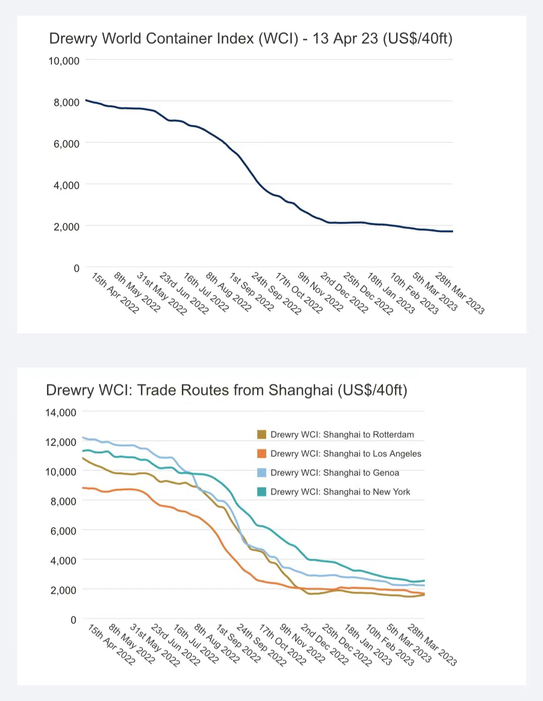 The latest Drewry WCI composite index of $1,709 per 40-foot container is now 84% below the peak of $10,377 reached in September 2021. It is 36% lower than the 10-year average of $2,688, indicating a return to more normal prices, but remains 20% higher than average 2019 (pre-pandemic) rates of $1,420.